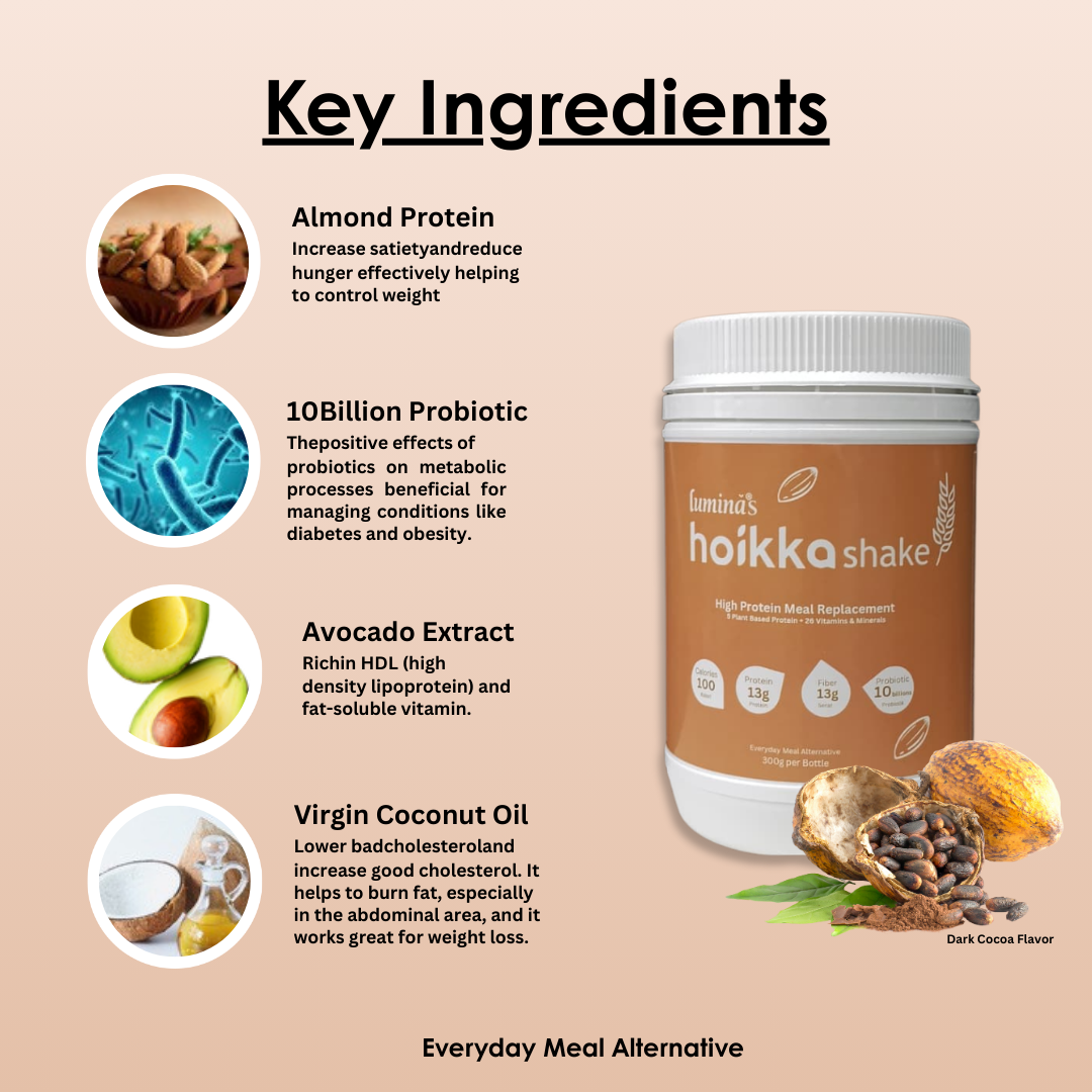 That’s why Hoikka Meal Replacement is thoughtfully crafted with almond protein, avocado extract, virgin coconut oil, and 10 billion live probiotics — a powerful blend designed to restore harmony to your gut.